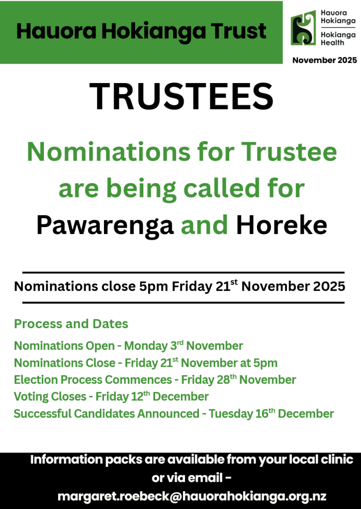 Nov 06 Comments Off on Horeke & Pawarenga Trustee Nominations Horeke & Pawarenga Trustee Nominations Posted by admin